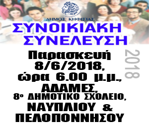 Τρίτη 22/5/2018 και ώρα 18.30 Συνοικιακή Συνέλευση με τη συμμετοχή των κατοίκων της Πολιτείας, στο 7ο Δημοτικό Σχολείο Κηφισιάς, Πλατεία Κηφισιάς.