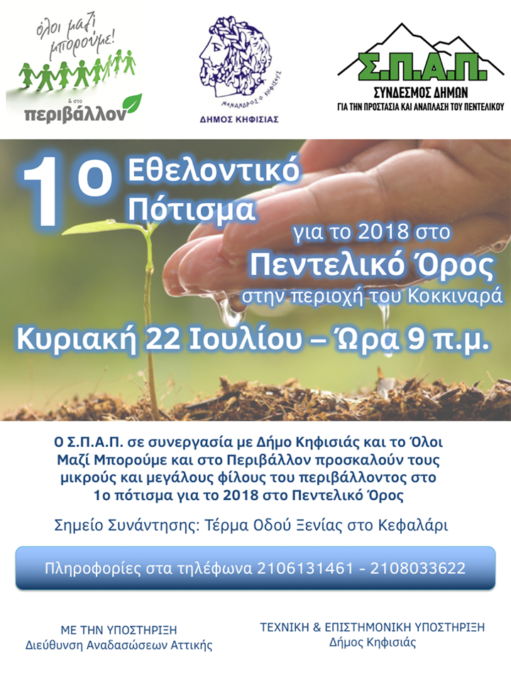 Ο Σύνδεσμος Δήμων για την Προστασία και Ανάπλαση του Πεντελικού (Σ.Π.Α.Π.) συνεχίζοντας την προσπάθεια για την όσο το δυνατόν καλύτερη αποκατάσταση του φυσικού περιβάλλοντος στο Πεντελικό όρος, διοργανώνει το 1ο Εθελοντικό Πότισμα 2018 στις περιοχές που αναδασώθηκαν τον περασμένο χειμώνα, στον Κοκκιναρά Κηφισιάς, σε συνεργασία με το Δήμο Κηφισιάς και το Όλοι Μαζί Μπορούμε και στο Περιβάλλον, την Κυριακή 22 Ιουλίου 2018 και ώρα 9 π.μ.