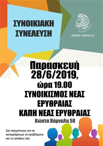 Παρασκευή 28/6/2019 και ώρα 19.00 θα πραγματοποιηθεί Συνοικιακή Συνέλευση στην συνοικία Συνοικισμός Νέας Ερυθραίας ΚΑΠΗ Νέας Ερυθραίας (Κώστα Βάρναλη 58), Νέα Ερυθραία.