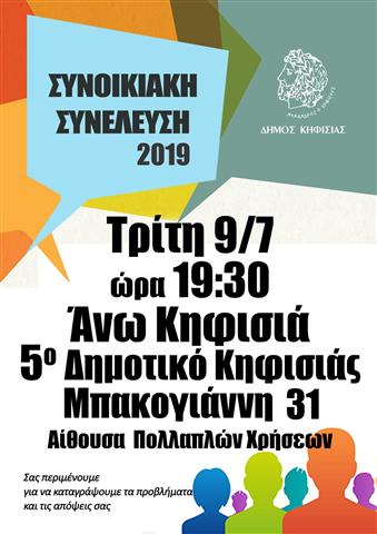Τρίτη 9/7/2019 και ώρα 19.30 θα πραγματοποιηθεί Συνοικιακή Συνέλευση στην Άνω Κηφισιά, στο 5ο Δημοτικό Σχολείο αίθουσα πολλαπλών χρήσεων (Μπακογιάννη 31)
