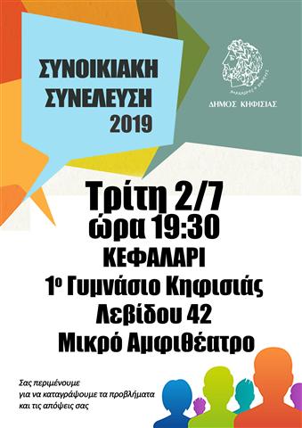 Τρίτη 2/7/ 2019 και ώρα 19.30 μ.μ. θα πραγματοποιηθεί Συνοικιακή Συνέλευση στη Συνοικία Κεφαλαρίου, στο 1ο Γυμνάσιο Κηφισιάς, (Λεβίδου 42 -μικρό αμφιθέατρο)