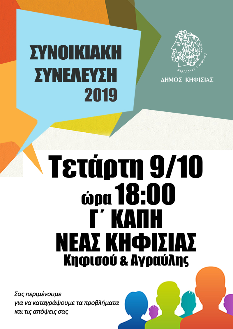 Τετάρτη 9/10/2019 και ώρα 18.00 θα πραγματοποιηθεί Συνοικιακή Συνέλευση στην συνοικία «Περιοχή Ελπιδοφόρου (δεξιά της Ελαιών)» στο Γ’ ΚΑΠΗ Ν. Κηφισιάς.