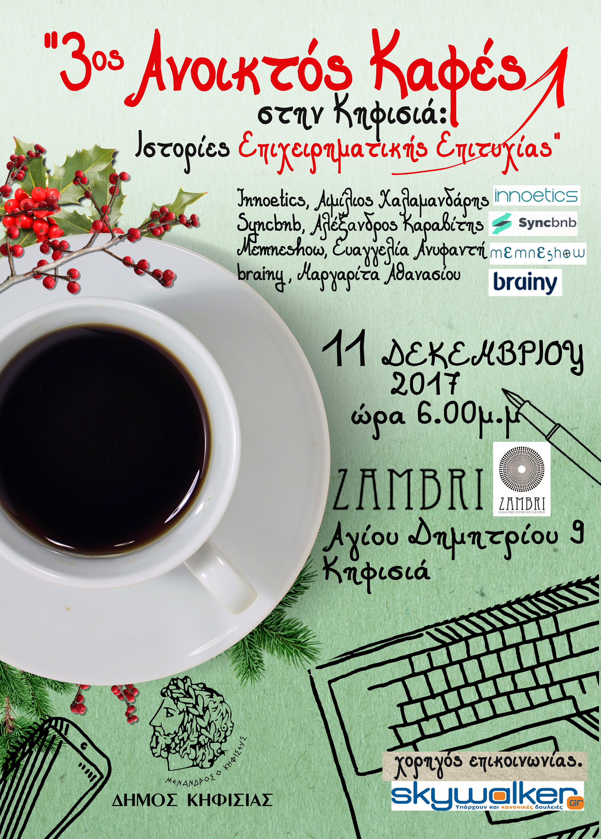 Ο 3ος Ανοικτός Καφές στην Κηφισιά: Ιστορίες Επιχειρηματικής Επιτυχίας θα πραγματοποιηθεί τη Δευτέρα 11 Δεκεμβρίου στις 6 μ.μ. στο Zambri στην Κηφισιά με ομιλητές τον κ.Αιμίλιο Χαλαμανδάρη από την εταιρεία