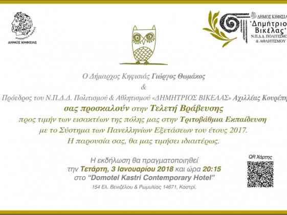 Τους πρωτοετείς φοιτητές και φοιτήτριες στην Τριτοβάθμια Εκπαίδευση βραβεύει ο Δήμος Κηφισιάς την Τετάρτη 3 Ιανουαρίου 2018 και ώρα 20.15 στο Domot
