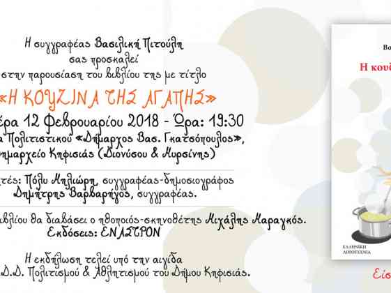 Η συγγραφέας Βασιλική Πιτούλη θα πραγματοποιήσει την παρουσίαση του βιβλίου της με τίτλο: «Η ΚΟΥΖΙΝΑ ΤΗΣ ΑΓΑΠΗΣ», τη Δευτέρα 12 Φεβρουαρίου 2
