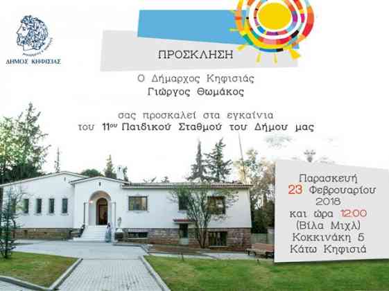 Ο Δήμαρχος Κηφισιάς Γιώργος Θωμάκος σας προσκαλεί στα εγκαίνια του 11ου Παιδικού Σταθμού του Δήμου μας, την Παρασκευή 23 Φεβρουαρίου 2018