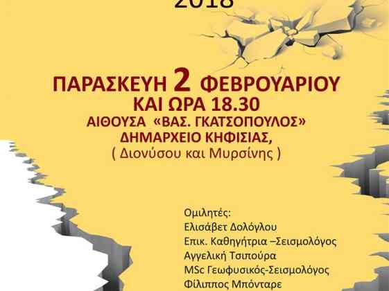 Η Πολιτική Προστασία του Δήμου Κηφισιάς οργανώνει την Παρασκευή 2 Φεβρουαρίου 2018 και ώρα 18.30 στην αίθουσα «Βασ.