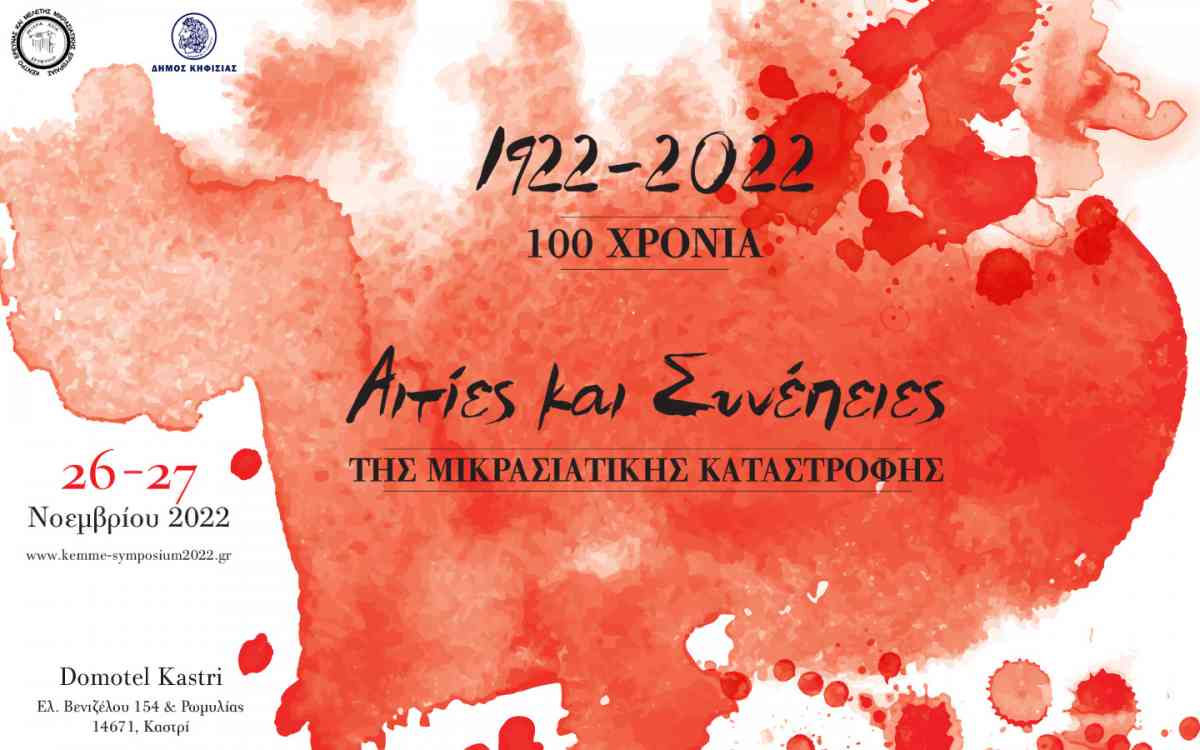 Με το 6ο Επιστημονικό Συμπόσιο του Κέντρου Έρευνας και Μελέτης της Μικρασιατικής Ερυθραίας (Κ.Ε.Μ.Μ.Ε.) του Δήμου Κηφισιάς, κορυφώνονται οι εκδηλώσεις μνήμης για τη συμπλήρωση 100 χρόνων από την καταστροφή της Μικράς Ασίας, ένα από μεγαλύτερα ιστορικά γεγονότα της Νεότερης Ελλάδας, στις 26 και 27 Νοεμβρίου 2022 στο Domotel Kastri.
