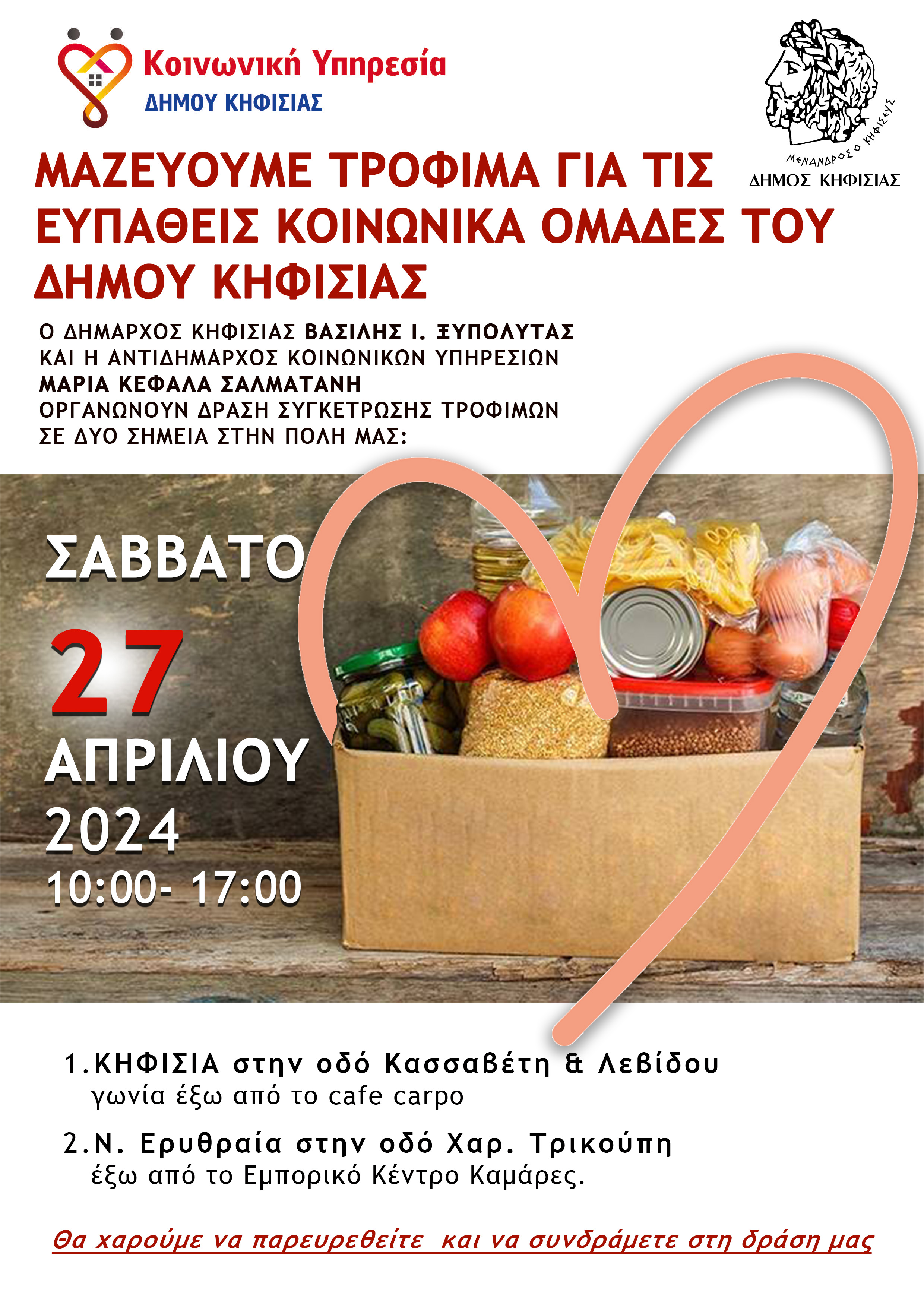 H Κοινωνική Υπηρεσία του Δήμου Κηφισιάς, διοργανώνει Δράση Συγκέντρωσης Τροφίμων ενόψει του Πάσχα , για την ενίσχυση ευάλωτων οικογενειών & πολιτών που εξυπηρετούνται από τα Κοινωνικά Παντοπωλεία του Δήμου μας.