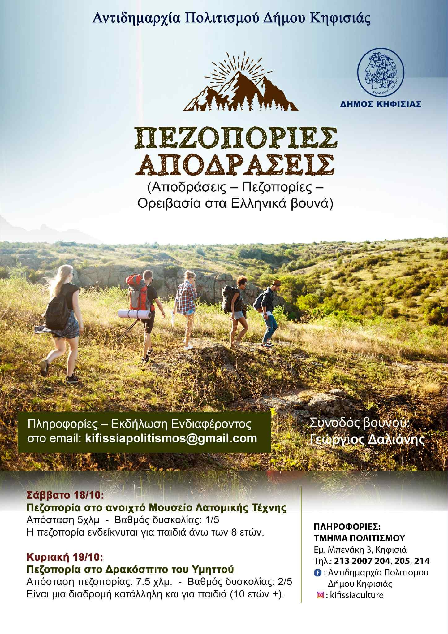 Αρχίζουν από το Σαββατοκύριακο 18-19 Οκτωβρίου οι πεζοπορίες και αποδράσεις που σχεδίασε και ενέταξε η Αντιδημαρχία Πολιτισμού του Δήμου Κηφισιάς στο πρόγραμμα Μαθημάτων Καλλιτεχνικής Παιδείας για ενήλικες και παιδιά 2025 – 2026.