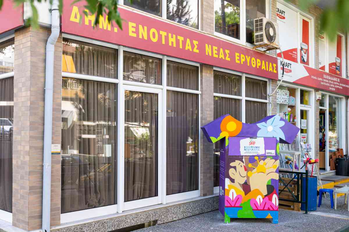 Πρόκειται για την Κοινωνική Ντουλάπα Skip η οποία τοποθετήθηκε στον εξωτερικό χώρο του Κοινωνικού Παντοπωλείου Νέας Ερυθραίας (Αναξαγόρα και Αθανασίου Διάκου).