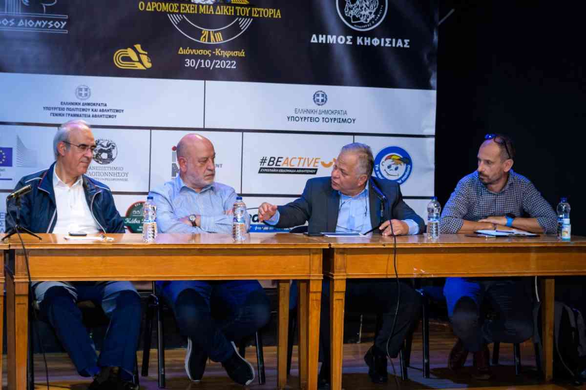 Στο πάνελ της Συνέντευξης Τύπου συμμετείχαν ο Εντεταλμένος Σύμβουλος Αθλητικών Εγκαταστάσεων και Διοργανώσεων Δήμου Διονύσου Παναγής Λουκάτος, ο Αντιδήμαρχος Εκάλης ΑχιλλέαςΚουρέπης, ο Διοικητής της Τροχαίας Κηφισιάς Γιώργος Χαλκιαδάκηςκαι ο μαραθωνοδρόμος και τεχνικός διευθυντής του αγώνα Νίκος Πολιάς