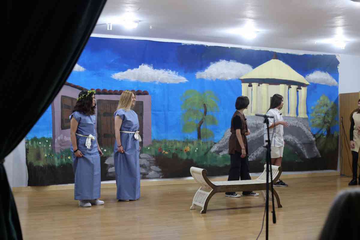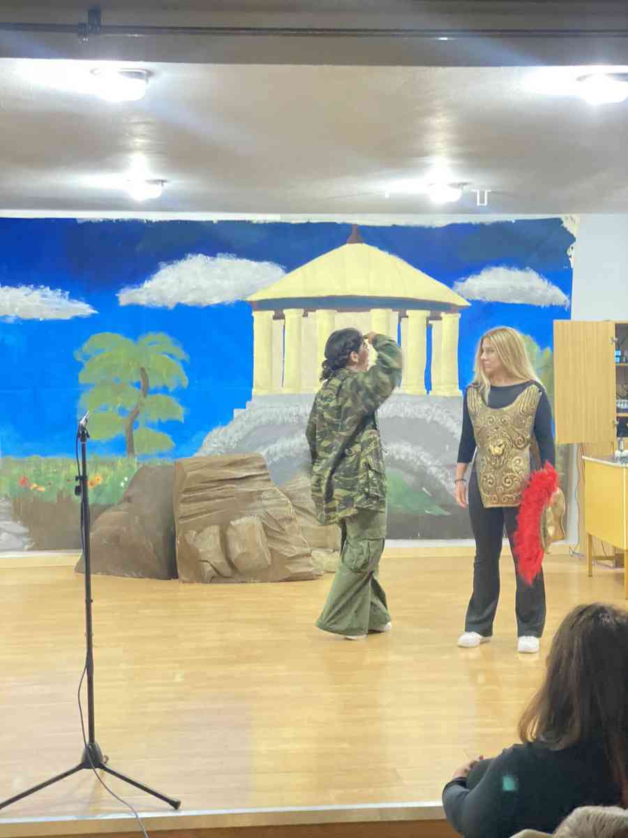 Πώς αντιδρά ένας απλός Αθηναίος χωρικός όταν βλέπει τη ζωή του να καταστρέφεται εξαιτίας του Πελοποννησιακού Πολέμου; Την απάντηση έδωσαν επί σκηνής οι δώδεκα μαθητές απ΄ όλες τις τάξεις του Γυμνασίου που συμμετείχαν φέτος στον Όμιλο. Τα παιδιά δούλεψαν στις πρόβες με ζήλο και υποδειγματική προσήλωση όλη τη χρονιά. Συνεργάστηκαν, εκφράστηκαν, πειραματίστηκαν, διασκέδασαν και έβγαλαν στην επιφάνεια ταλέντα και δεξιότητες. Και το πιο σημαντικό : έγιναν φίλοι μέσα από τη δημιουργία.