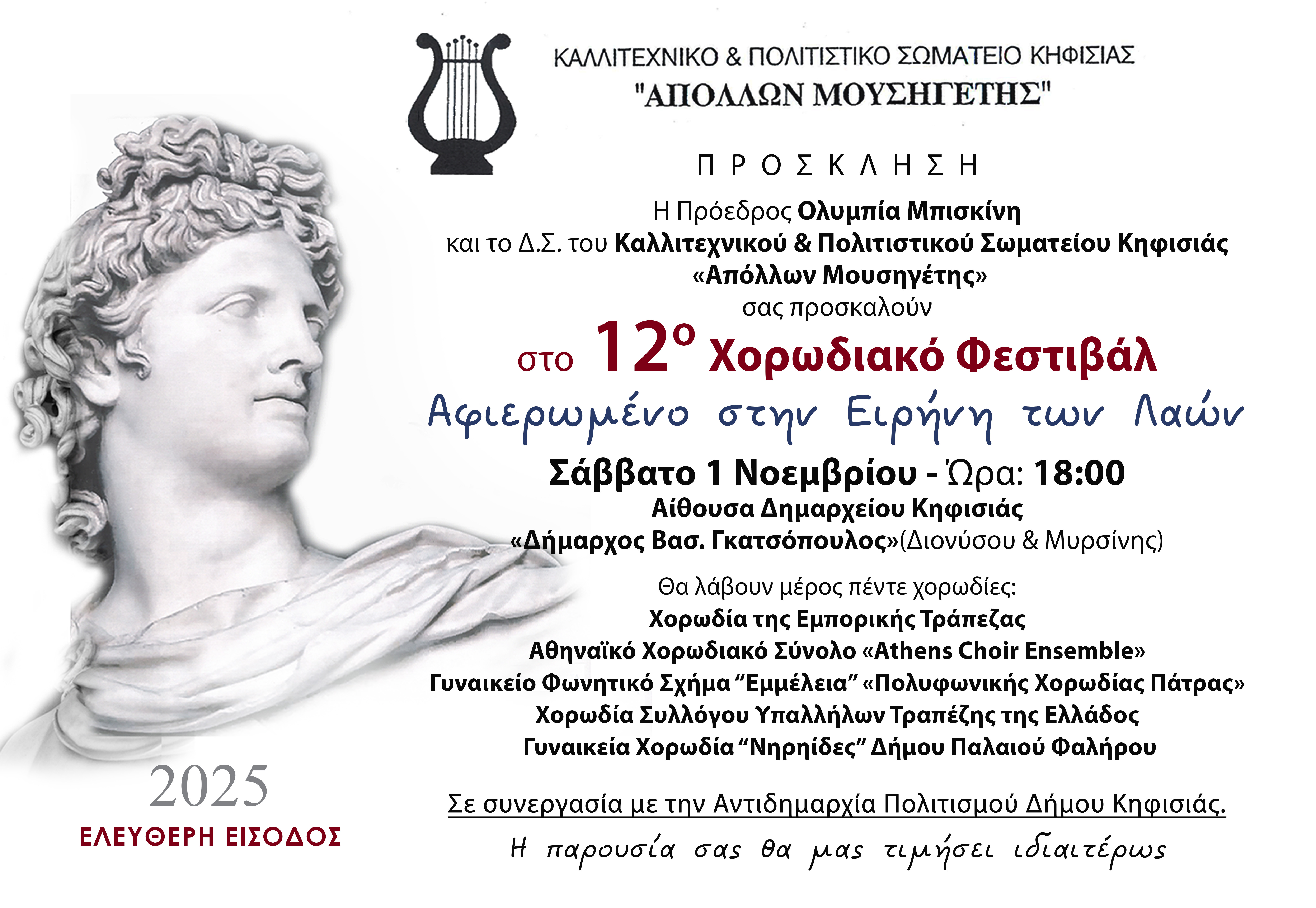 Η Πρόεδρος Ολυμπία Μπισκίνη και το Δ.Σ. του Καλλιτεχνικού & Πολιτιστικού Σωματείου Κηφισιάς «Απόλλων Μουσηγέτης» σας προσκαλούν στο 12ο Χορωδιακό Φεστιβάλ που θα πραγματοποιηθεί το Σάββατο 1 Νοεμβρίου 2025, στις 18:00 στην Αίθουσα Δημαρχείου Κηφισιάς «Δήμαρχος Βασ. Γκατσόπουλος» (Διονύσου & Μυρσίνης), με τη στήριξη της Αντιδημαρχίας Πολιτισμού του Δήμου Κηφισιάς.