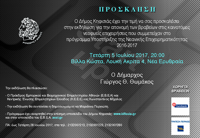 Πραγματοποιήθηκε την Τετάρτη 5 Ιουλίου 2017 η απονομή των βραβείων Επιχειρηματικότητας, του Προγράμματος για την Υποστήριξη της Νεανικής Επιχειρηματικότητας του Δήμου Κηφισιάς,  στη Βίλλα Κώστα, με τη παρουσία του Δήμαρχου Κηφισιάς κ. Γιώργου Θωμάκου και του προέδρου του ΕΒΕΑ, κ. Κωνσταντίνου Μίχαλου.