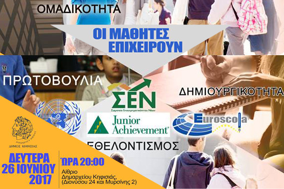Οι αξιόλογες προτάσεις των μαθητών και των μαθητριών των σχολείων του Δήμου μας που συμμετείχαν στο εκπαιδευτικό πρόγραμμα «Εικονική Επιχείρηση» του «Σωματείου Επιχειρηματικότητας Νέων/Junior Achievement Greece, στο μαθητικό συνέδριο προσομοίωσης των εργασιών του Οργανισμού Ηνωμένων Εθνών (ΜUN) καθώς και στο Ευρωπαϊκό Πρόγραμμα Euroscola, θα παρουσιαστούν την Δευτέρα 26 Ιουνίου 2017...