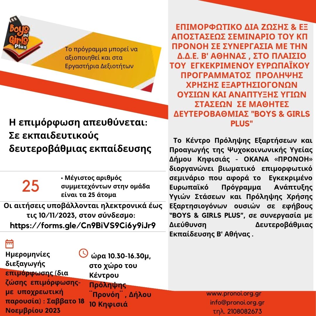 Το Κέντρο Πρόληψης των Εξαρτήσεων και Προαγωγής της Ψυχοκοινωνικής Υγείας «Προνόη» του Δήμου Κηφισιάς – ΟΚΑΝΑ, υλοποίησε το Σάββατο 18 Νοεμβρίου 2023 τον 8ο κύκλο του επιμορφωτικού σεμιναρίου εκπαιδευτικών δευτεροβάθμιας εκπαίδευσης, του ευρωπαϊκού προγράμματος  Αγωγής Υγείας BOYS & GIRLS PLUS.