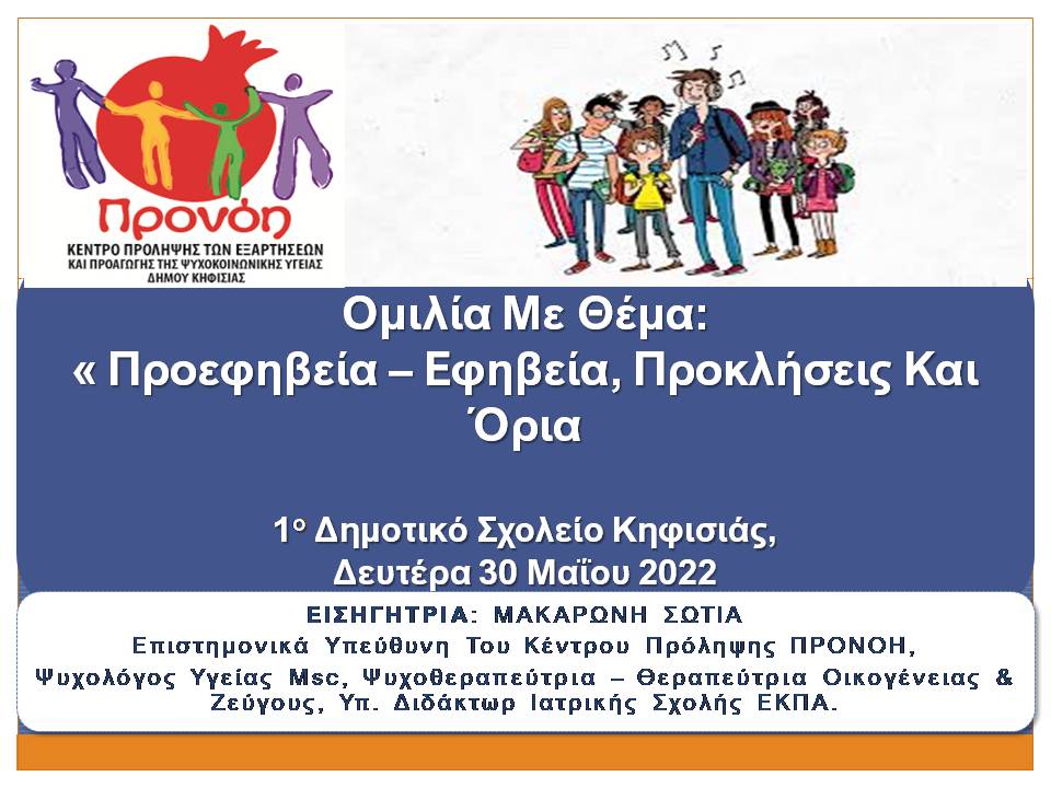 Τον Μάιο του 2022 πραγματοποιήθηκαν δύο πολύ ενδιαφέρουσες παρεμβάσεις σε 90 γονείς παιδιών της πρωτοβάθμιας και δευτεροβάθμιας εκπαίδευσης, από το ΚΠ ΠΡΟΝΟΗ του Δήμου Κηφισιάς