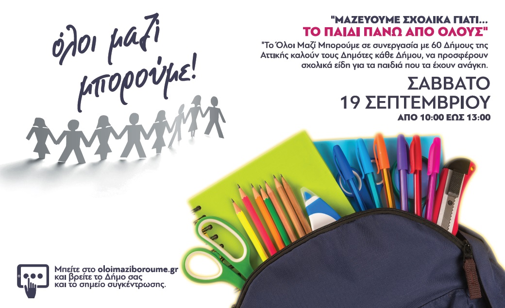 Με μεγάλη επιτυχία και παρά τις αντίξοες καιρικές συνθήκες, διοργανώθηκε το Σάββατο 19 Σεπτ. 2020,από τον Δήμο Κηφισιάς και τη δράση του ΣΚΑΪ «Όλοι Μαζί Μπορούμε», η συγκέντρωση σχολικών ειδών για τη νέα σχολικής χρονιά με κεντρικό μήνυμα «Το παιδί πάνω απ’ όλους».