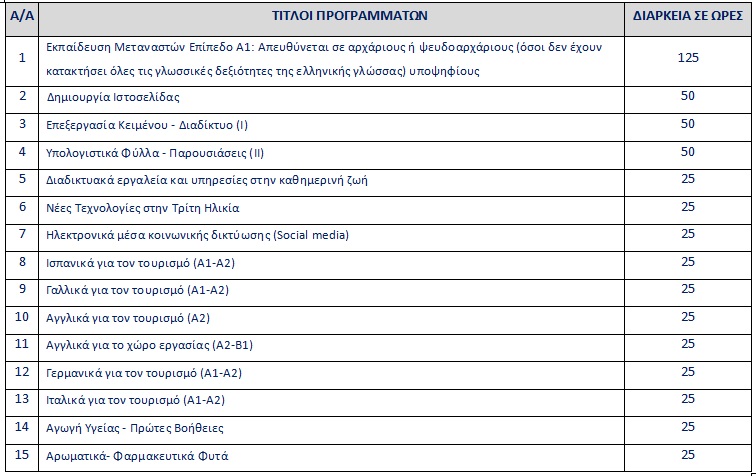 Στο Κ.Δ.Β.Μ. του Δήμου Κηφισιάς μπορούν να δημιουργηθούν τμήματα για τα ακόλουθα προγράμματα: