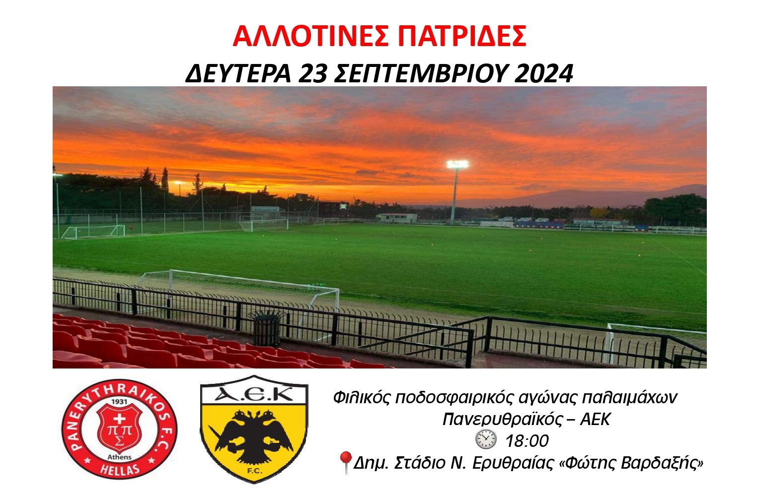 Με ένα ξεχωριστό αθλητικό γεγονός, τον φιλικό αγώνα των Παλαίμαχων ποδοσφαιριστών του Πανερυθραϊκού και της ΑΕΚ, έπεσε το απόγευμα της Δευτέρας 23 Σεπτεμβρίου στο Δημοτικό Στάδιο Νέας Ερυθραίας «Φώτης Βαρδαξής» η αυλαία των «Αλλοτινών Πατρίδων 2024», που διοργανώθηκαν υπό την αιγίδα του Κέντρου Έρευνας και Μελέτης της Μικρασιατικής Ερυθραίας (ΚΕΜΜΕ) και του Δήμου Κηφισιάς.