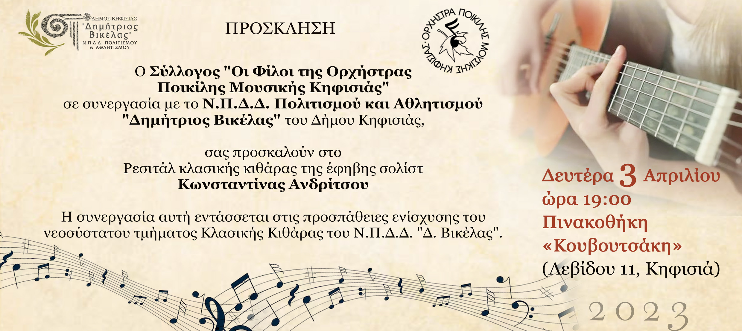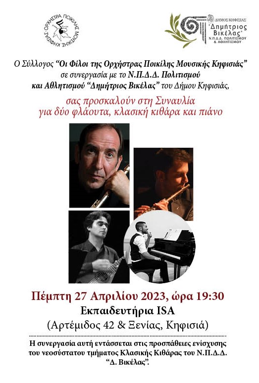Ο Σύλλογος “Οι Φίλοι της Ορχήστρας Ποικίλης Μουσικής Κηφισιάς” σε συνεργασία με το Ν.Π.Δ.Δ. Πολιτισμού και Αθλητισμού “Δημήτριος Βικέλας” του Δήμου Κηφισιάς,