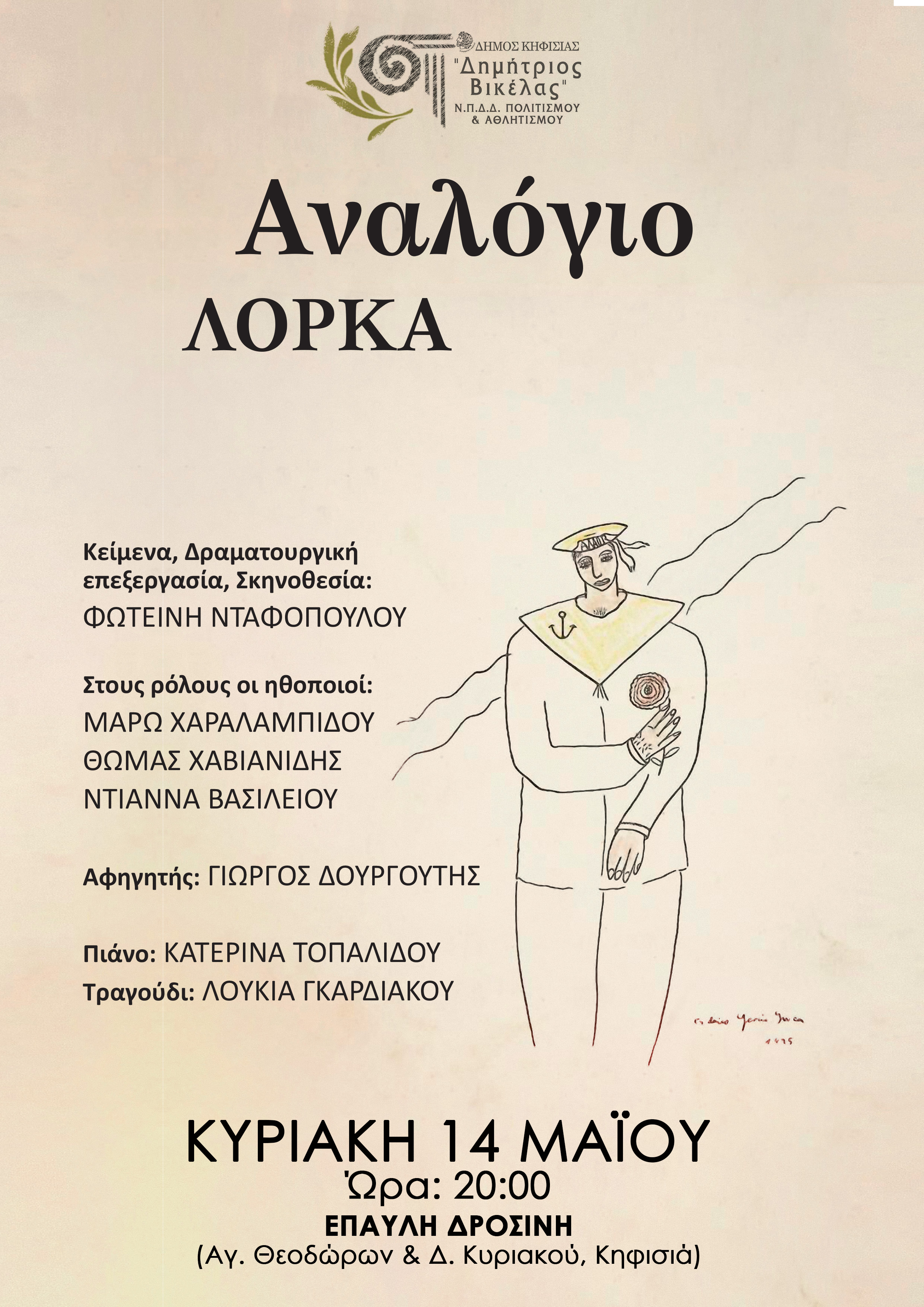 Στην κατάμεστη έπαυλη “Δροσίνη” παρουσιάστηκε η θεατρική παράσταση «Αναλόγιο Λόρκα» σε μια πολιτιστική βραδιά που προσέφερε το Ν.Π.Δ.Δ. Πολιτισμού και Αθλητισμού ''Δημήτριος Βικέλας''.