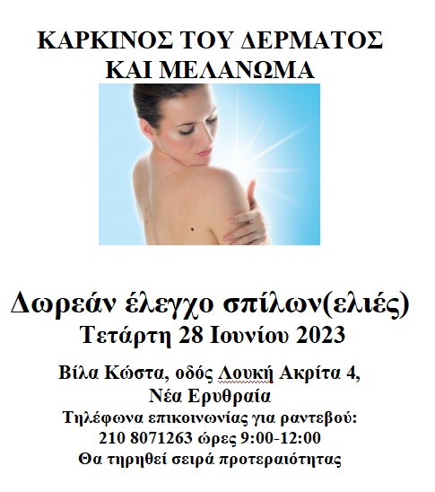 Το ΚΕΠ ΥΓΕΙΑΣ του Δήμου Κηφισιάς διοργανώνει δωρεάν εξέταση σπίλων (ελιές) για την πρόληψη καρκίνου του δέρματος.