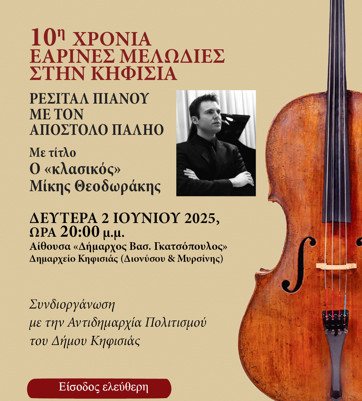 το Σάββατο 17 Μαΐου 2025, ώρα 19:30, στην Αίθουσα Δημαρχείου Κηφισιάς «Δήμαρχος Βασ. Γκατσόπουλος» (Διονύσου & Μυρσίνης)