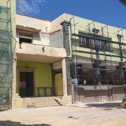 Συνεχίζονται οι εργασίες ενίσχυσης της πέτρας, μόνωσης της οροφής και αποκατάστασης της αίθουσας πολλαπλών χρήσεων σύμφωνα πάντα με τη μελέτη, καθώς και οι εργασίες σύνδεσης του υφιστάμενου κτηρίου με το νέο κτήριο.