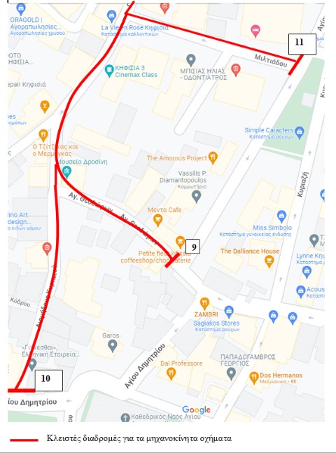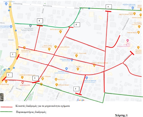 .Η κίνηση των οχημάτων δεν θα επιτρέπεται τις συγκεκριμένες ώρες σε δρόμους του κέντρου της Κηφισιάς και η διοχέτευση της κυκλοφορίας θα γίνεται μέσω εναλλακτικών διαδρομών όπως φαίνεται στους σχετικούς χάρτες.