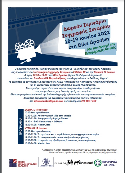 Ο Δήμαρχος Κηφισιάς Γιώργος Θωμάκος και το ΝΠΠΔ «Δ. ΒΙΚΈΛΑΣ» του Δήμου Κηφισιάς, σας προσκαλούν στο 1ο Σεμινάριο Συγγραφής Σεναρίου το Σάββατο 18 και την Κυριακή 19 Ιουνίου & ώρες 10:30 – 16:00 στην Βίλα Δροσίνη (Αγίων Θεοδώρων & Κυριακού) στο πλαίσιο του 1ου Φεστιβάλ Μικρού Μήκους που διοργανώνουν οι Εκδόσεις Κηφισιά.