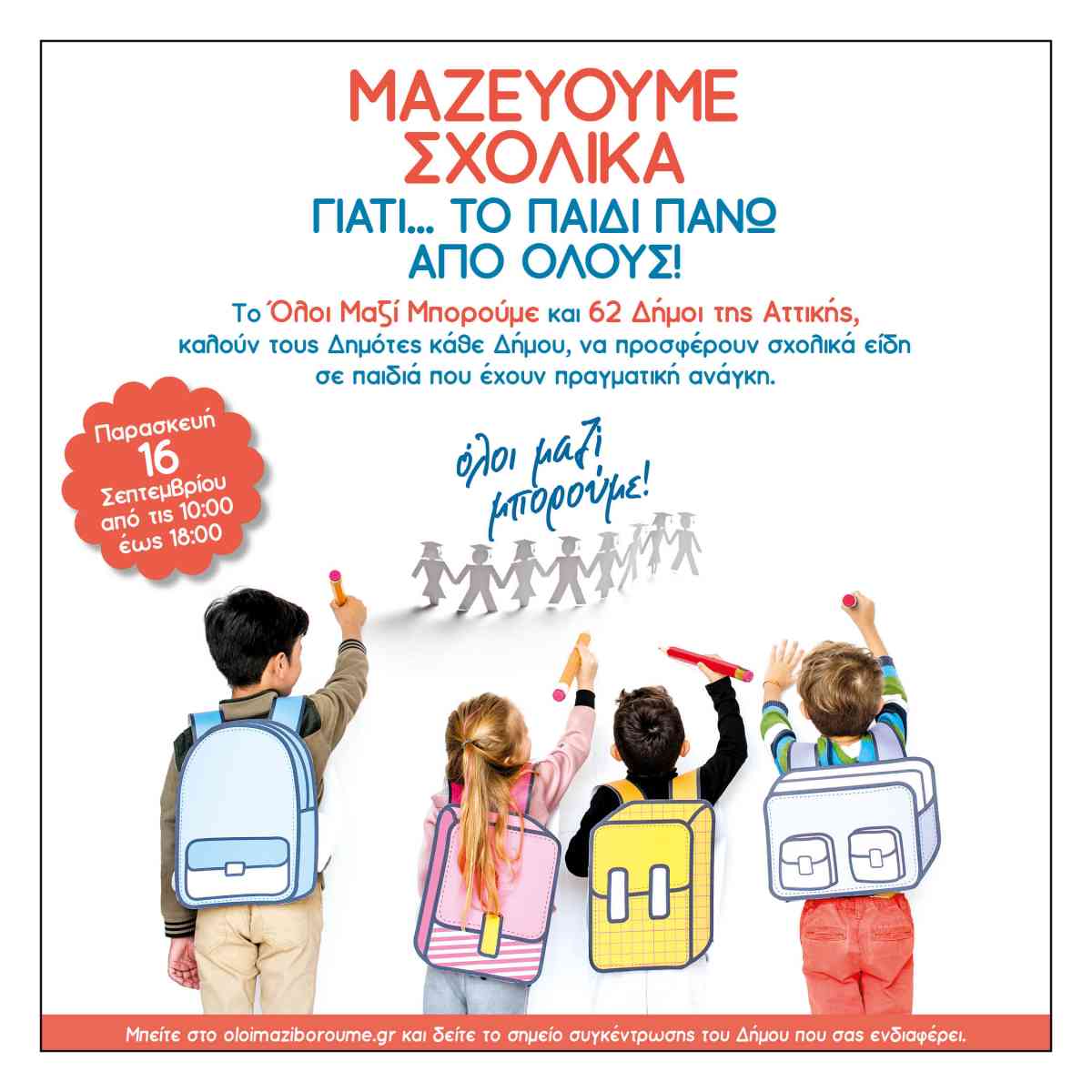 Ο Δήμος Κηφισιάς συμμετέχει στη δράση συγκέντρωσης σχολικών ειδών του «Όλοι Μαζί Μπορούμε» και των Δήμων της Αττικής.