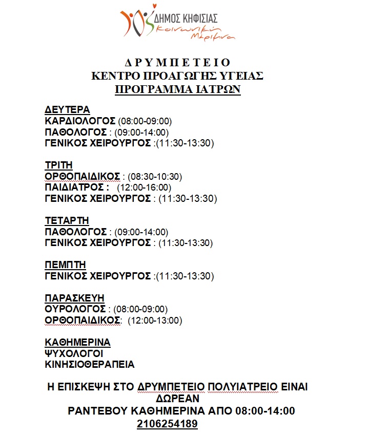 Δείτε επίσης: Δημοτικό Πολυϊατρείο «Διονύσιος Βαρελάς» ( Μαρ. Αντύπα 3 Κάτω Κηφισιά) Τηλ: 2108012632 (Μπορείτε να δείτε το αναλυτικό πρόγραμμα (εδώ)
