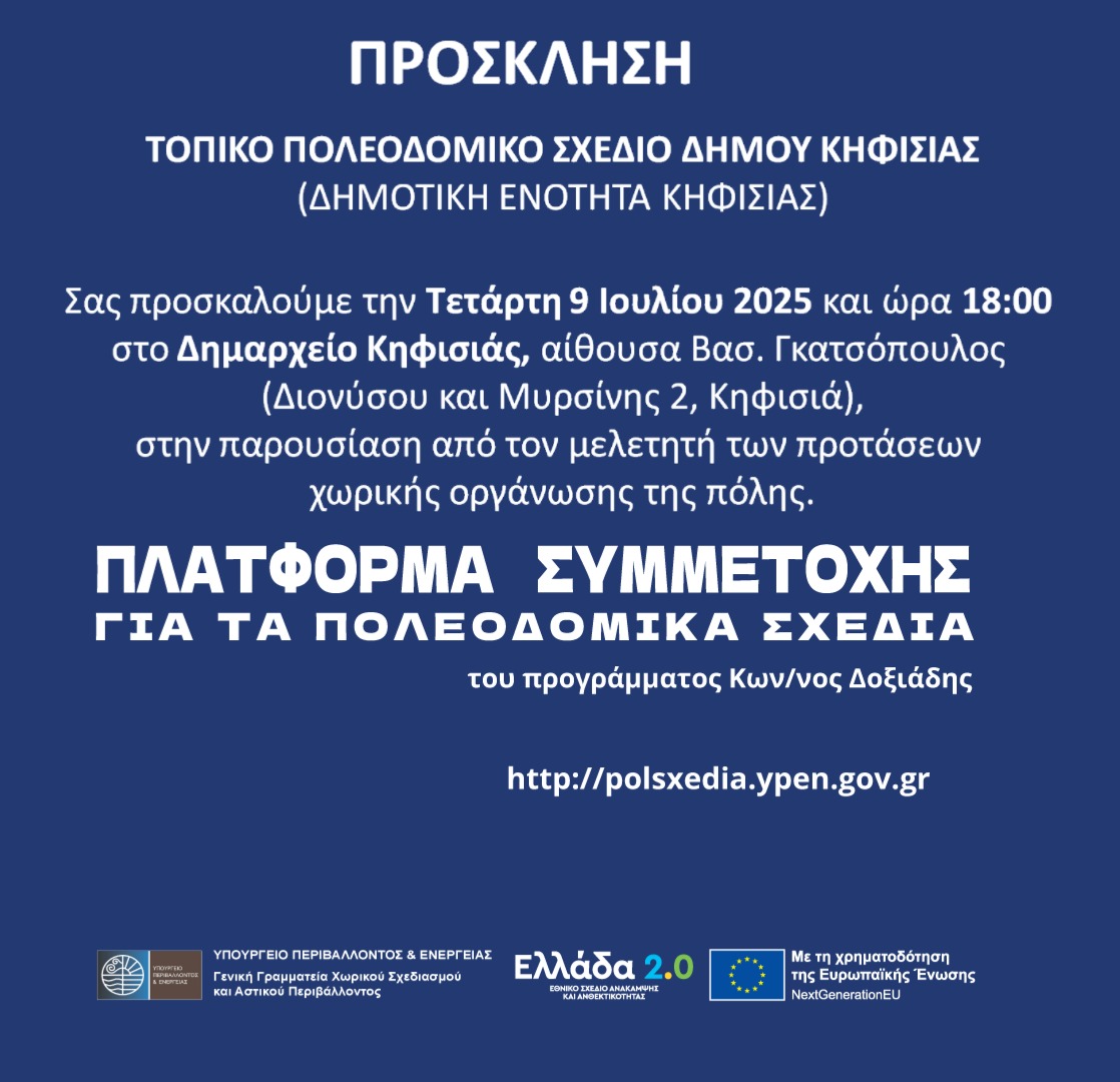 Η εκδήλωση θα πραγματοποιηθεί την Τετάρτη 9 Ιουλίου 2025, ώρα 18:00, στην Αίθουσα «Β. Γκατσόπουλος» του Δημαρχείου Κηφισιάς (Διονύσου & Μυρσίνης 2), με στόχο την ενημέρωση και ενεργή συμμετοχή των πολιτών, των τοπικών φορέων και των επαγγελματιών της περιοχής στη διαμόρφωση του τελικού σχεδιασμού.