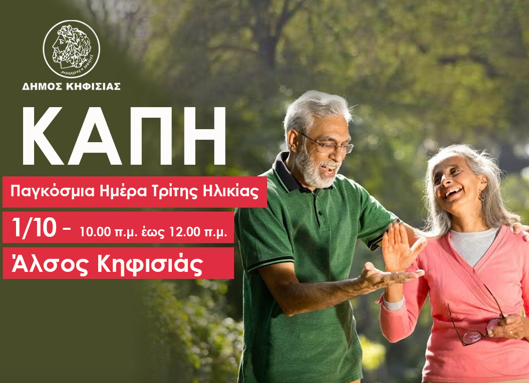 Ο Εντεταλμένος Δημοτικός Σύμβουλος Φροντίδας & Μέριμνας για την Τρίτη Ηλικία του Δήμου Κηφισιάς - Ν. Ερυθραίας & Εκάλης κ. Δημήτρης Καρράς στο πλαίσιο του εορτασμού της Παγκόσμιας Ημέρας Τρίτης Ηλικίας, σας προσκαλεί με χαρά την 1η Οκτωβρίου, από τις 10.00 π.μ. έως 12.00 π.μ. σε μια όμορφη συνάντηση γεμάτη χαμόγελα και καλή παρέα.