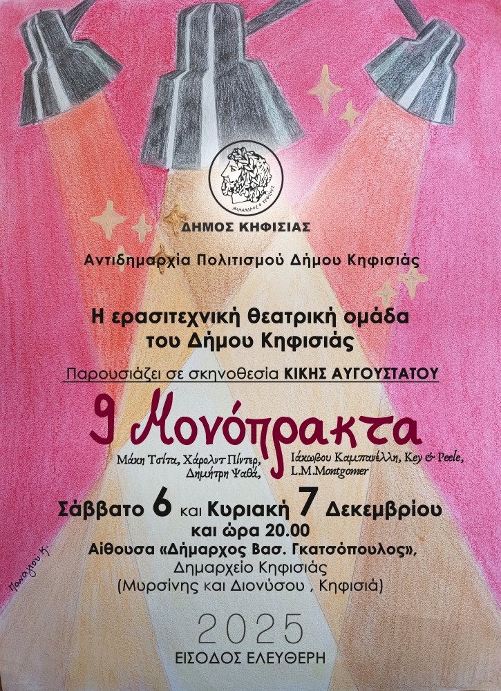 Η Ερασιτεχνική Θεατρική Ομάδα του Δήμου Κηφισιάς σε συνεργασία με την Αντιδημαρχία Πολιτισμού παρουσιάζει το Σάββατο 6 & την Κυριακή 7 Δεκεμβρίου 2025 στις 20.00 στην Αίθουσα Δημαρχείου Κηφισιάς «Δήμαρχος Βασ. Γκατσόπουλος» (Διονύσου & Μυρσίνης) 9 Μονόπρακτα.