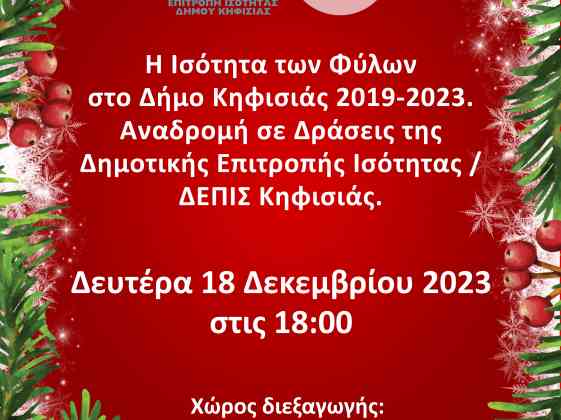 Η Δημοτική Επιτροπή Ισότητας του Δήμου Κηφισιάς (ΔΕΠΙΣ) διοργανώνει την τελευταία της εκδήλωση για την τρέχουσα δημοτική περίοδο 2019-2023, η οποία