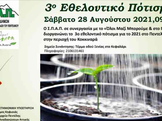 Ο ΣΠΑΠ διοργανώνει το 3ο Εθελοντικό Πότισμα για το 2021 στο Πεντελικό, στον Κοκκιναρά Κηφισιάς σε συνεργασία με το «Όλοι Μαζί Μπορούμε και στο Περι
