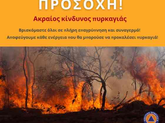Σύμφωνα με το Χάρτη Πρόβλεψης Κινδύνου Πυρκαγιάς που εκδίδει η Γενική Γραμματεία Πολιτικής Προστασίας του Υπουργείου Προστασίας του Πολίτη (w