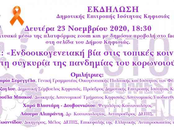 Τη Δευτέρα 23 Νοεμβρίου 2020, ώρα 18:30, η Δημοτική Επιτροπή Ισότητας Κηφισιάς ΔΕΠΙΣ, με αφορμή την Παγκόσμια Ημέρα Εξάλειψης της Βίας κατά των Γυν