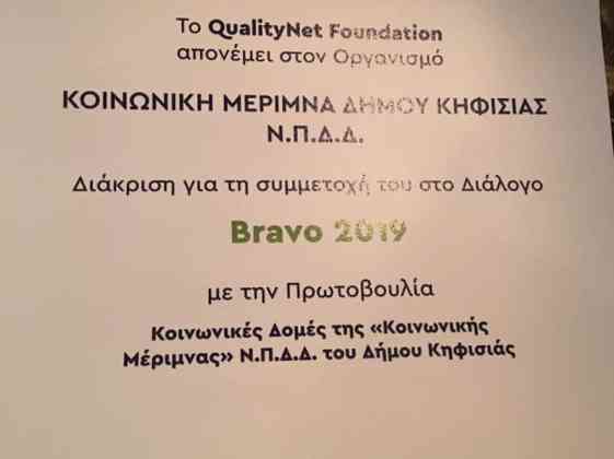 Μία ακόμα σημαντική διάκριση έλαβε ο Δήμος Κηφισιάς στο πλαίσιο του θεσμού των Βραβείων Bravo για τις Κοινωνικές του δομές.
