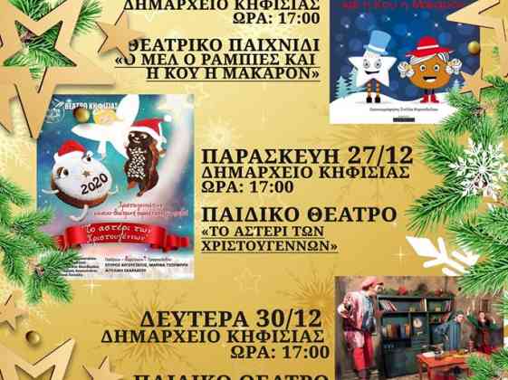 Όπως κάθε Χριστούγεννα, έτσι και φέτος υπάρχουν στο πρόγραμμα του Δήμου Κηφισιάς "Χριστούγεννα στην Κηφισιά 2019" παιδικές εορταστικές παραστάσεις