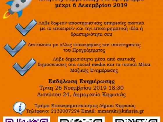 Την Τρίτη 26 Νοεμβρίου και ώρα 18:30 θα πραγματοποιηθεί η εκδήλωση έναρξης του προγράμματος Στήριξης Επιχειρηματικότητας του Δήμου Κηφισιάς, στην α