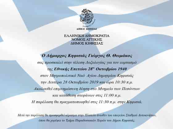 Ο Δήμος Κηφισιάς θα εορτάσει και εφέτος με την αρμόζουσα επισημότητα την εθνική επέτειο της 28ης Οκτωβρίου καθώς και την μνήμη του πολιούχου του Δή