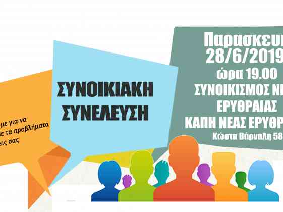 Παρασκευή 28/6/2019 και ώρα 19.00 θα πραγματοποιηθεί Συνοικιακή Συνέλευση στην συνοικία Συνοικισμός Νέας Ερυθραίας ΚΑΠΗ Νέας Ερυθραίας (Κώστα Βάρνα