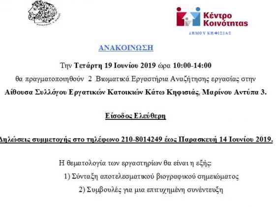 Εργαστήρια Αναζήτησης Εργασίας & Επαγγελματικών Δεξιοτήτων-Κέντρο Κοινότητας Δήμου Κηφισιάς