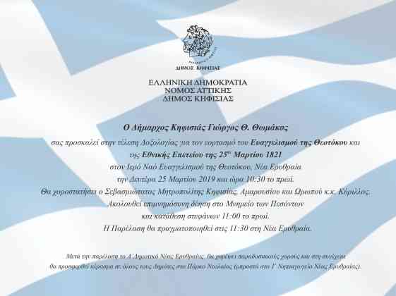 Ο Δήμος Κηφισιάς και ο Δήμαρχος Γιώργος Θωμάκος γιορτάζουν την Εθνική Επέτειο της 25ης Μαρτίου και προσκαλούν τους πολίτες να συμμετέχουν στις εορτ