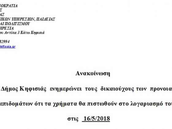 Ο Δήμος Κηφισιάς ενημερώνει τους δικαιούχους των προνοιακών επιδομάτων ότι τα χρήματα θα πιστωθούν στο λογαριασμό τους στις