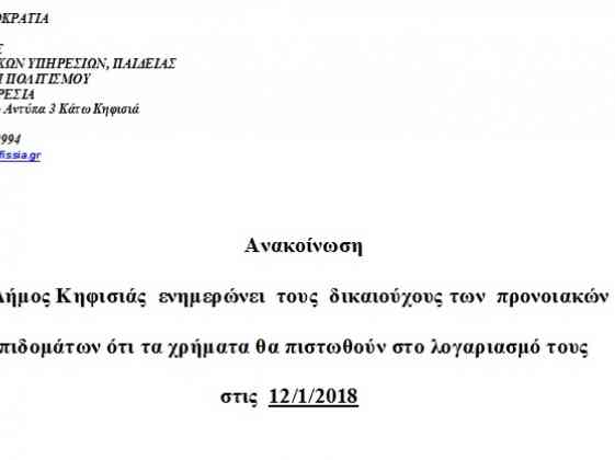 Ο Δήμος Κηφισιάς ενημερώνει τους δικαιούχους των προνοιακών επιδομάτων ότι τα χρήματα θα πιστωθούν στο λογαριασμό τους στις